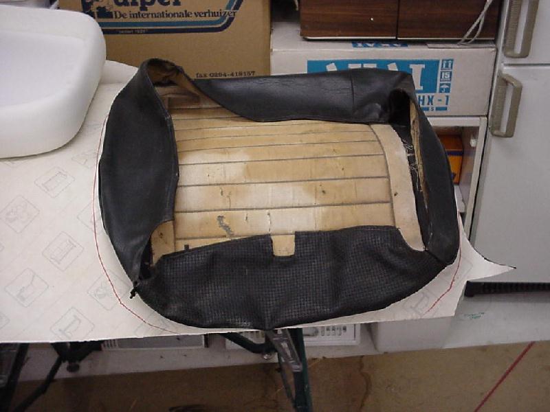 After a while you will have pulled that cover all over the backrest. Now put your knees on the bottom cushion in order to slide the front flap through to the backside with the wire in it. This has to be engaged to the metal tabs at the back. Do the same with the backside flap. Now gently taper these tabs flat so they do not stick out anymore, making sure they will not break in the process. If you do so; it is welder time again!! Finally, insert the headrest with its bushes.