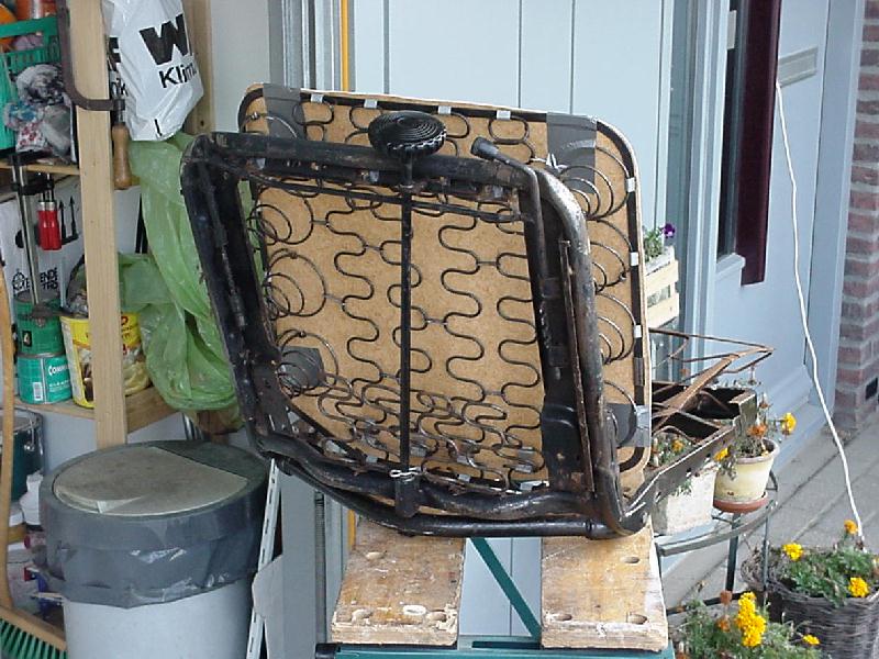 The cross brace you see in the backrest is the frame for the headrests, they can be transplanted from a donor chair. But thats another story and concerns mostly us Europeans, so if you got questions about this email me. For long time readers; note the green crate on the right top, this is my fuel heater parts bin(see "heating" in the Type 2 library)