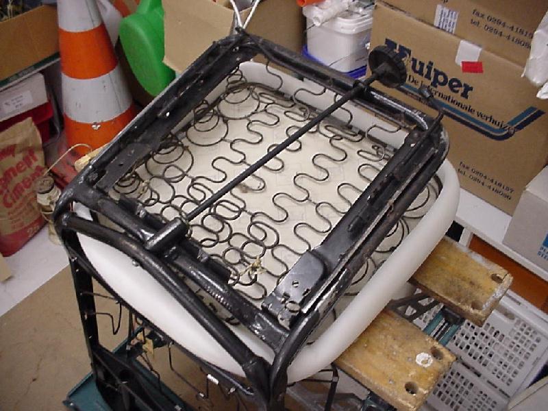So the base is ready now. The backrest is simply a matter of performing the same trick cutting the protective layer. The catch is that the new padding here really makes its presence known. At first it will look as if the padding will not fit, or that you ordered the wrong item (double checking before ordering is a good idea anyway!!). In my opinion this is the ultimate patience/caracter test. I suggest a little break before putting this cover back. It might also help if you made sure that the backrest cover is at room temperature. I did the first seat during the early fall and finished the other seat in the last week of 1999. I noticed the difference while handling the cover during installation. Best is to work at the left and right side of the backrest; pulling it down each at a time. Take time & make sure not to rip the cover, while assuring that the seams align with the frame just as they did before. As you might notice from the picture below I tampered a little with the backrest bottom springs. This allows you to sit further back on the seat a bit while your spine halfway up gets more support from the springs.
