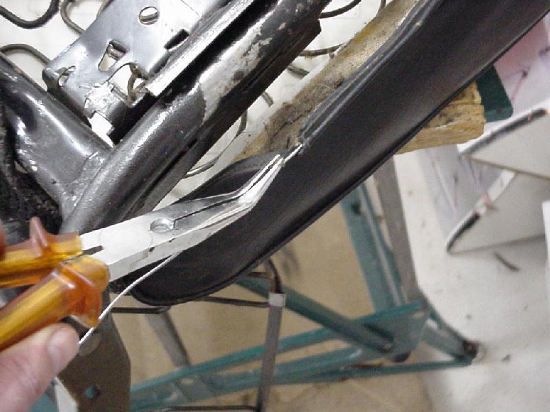 Once the wire is in, hook the metal tabs at the front of the seat back into place. Slide the wire trought the back section of the cover as well. Make sure it is routed correct over the adjustment rod in the middle (the shortest way is best) engage these lips here also. Now insert the small pieces of wire near the seat rails. Pull them tight while holding the seat frame down (seat in the upside down position) and twist them and the same time (patience test #2). Cut any excess wire off and fold it out of the way so you will not cut yourself later. Now it is time to pull the "cover" wire tight. If you have a helper handy let him/her press down the seatframe a little so you have the opportunity to secure the wire end to the frame (patience test #3).