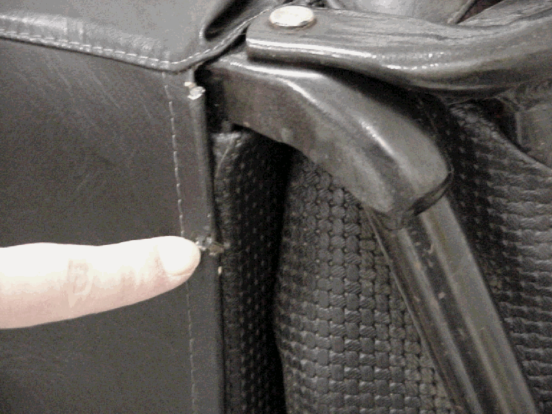 The base seat cover is held to the frame by means of a metal wire, which is joined together at the left bottom (see picture above & below). Again, those triangular tabs mentioned before are also present here; two on the rear (near the middle) and three in front of the seat. Carefully pry these up. In my experience this works best with a little flathead screwdriver and patience of course!