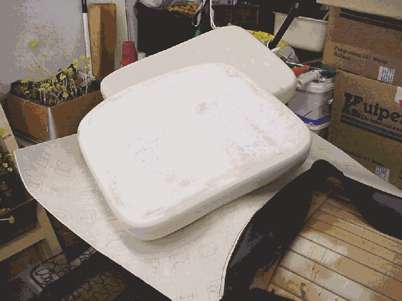 Below you see the paddings as I got them from TMI. They arrived flatpacked; I ordered two sets for both front seats. I installed a "real" passenger seat (which adjusts and everything) by welding "driver" seatrails on the other side. Because my bus was original an army vehicle there where no mounting points for a passenger seat whatsoever. So after careful measurements I welded those rails into place. Although my bus is a 76 allright, it has 68-74 rails installed as original equipment, maybe this was to upset any Russians?! Thats how come I had to do two earlier driver seats. I do not know for sure if these paddings also fit an original passenger seat for a type 23 (with walk thru).