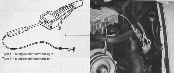 Connect test light between center slot in moulded connector of series resistance and vehicle ground.