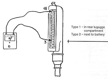 The resistance between two terminals can be checked at the CPU end of the wiring harness. Access is usually easier and the harness wires get checked at the same time.