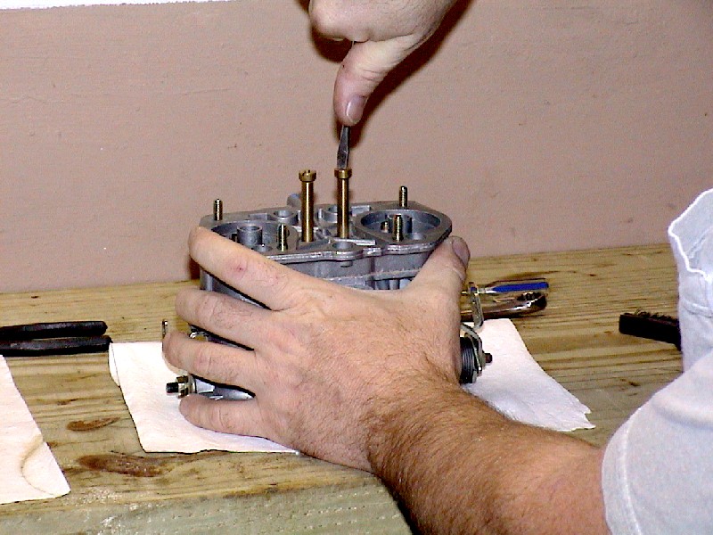 Remove the main jet stacks (these are comprised of the emulsion tube holders, emulsion tubes, air correction jets, and main jets, all in one unit.