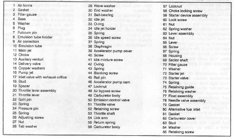 I just set them to about 10mm and use the caliper OD arms to check the float. The tabs that are illustrated on the above picture, in red, are what you bend. The red one is for the 10mm setting, and the blue one is for the other. When you do it, make sure you are measuring with the needle valve ball NOT compressed. One way to do this easy is turn the assembly sideways, so the float is rotating on the pin like a door on a hinge, and the tilt it so that the float is just resting on the ball, and then measure. Use the tabs to set the float correctly. Mine out of the box was about 14mm and 20mm which is way way off. Once done cleaning, reassembly is reverse of disassembly. Don't over tighten, and take your time. Jetting is another story. Hope this helps. This is a basic procedure for cleaning out the crap that gets in them at assembly time. Additional diagrams for parts reference (note this one is a little different, older Italian model with pever style accelerator pumps. It serves as a fair reference for the rest. |