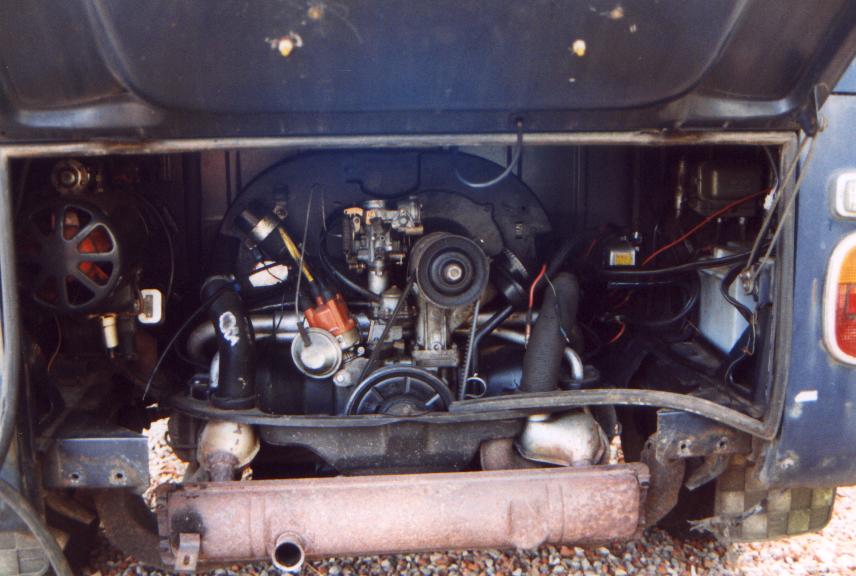 The bus wasn't running when I bought it. The clutch didn't work. This problem was easily fixed thanks to the early bus design which is very friendly to dedicated engine-removers like myself. Simply remove the bumper, the rear plate under the engine lid, a few bolts, stick a jack on wheels under the engine and roll it out. We were used to late Baywindows, they have the rear plate welded to the body which makes it a whole lot harder to remove the engine.